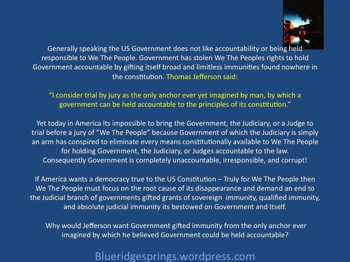 With elimination of civilian rights to a grand jury, and a judicial system, which disposes of the Jury trial, Government and the judicial system have abolished the people’s abilities to hold Government representatives and the Judiciary accountable to the law. With a Government of treasonous representatives protecting a treasonous group of jurist who reciprocate a nation of, for and by the people has become a Government of, for, and by despotic tyranny of the people in business for its own enrichment.